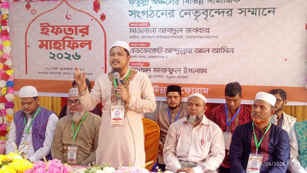 ফতুল্লা থানা প্রতিনিধি আল আমিন মিজি সকল সামাজিক সংগঠন ঐক্যবদ্ধভাবে কাজ করলে মাদক ও সন্ত্রাসমুক্ত সমাজ গঠন করা সম্ভব বলে মন্তব্য করেছেন মাওলানা আবদুল জব্বার। তিনি আজ ফতুল্লার দেলপাড়া আপ্যায়ন কমিউনিটি সেন্টারে ফতুল্লার বিভিন্ন সামাজিক সংগঠনের উদ্যোগে ইফতার মাহফিলে প্রধান অতিথি হিসেবে উপস্থিত ছিলেন। তিনি বলেন, মাদক ও সন্ত্রাস শুধু ব্যক্তি বা পরিবারকেই ধ্বংস করে না, বরং একটি জাতির ভবিষ্যৎকে অন্ধকারের দিকে ঠেলে দেয়। তাই এ ভয়াবহ সামাজিক ব্যাধি নির্মূলে সবাইকে সম্মিলিতভাবে এগিয়ে আসতে হবে। তিনি আরও বলেন, তরুণ সমাজকে মাদক ও অপরাধ থেকে রক্ষা করতে হলে পরিবার, শিক্ষা প্রতিষ্ঠান, সামাজিক ও ধর্মীয় সংগঠনসহ সকলকে দায়িত্বশীল ভূমিকা পালন করতে হবে। নৈতিক শিক্ষা ও ধর্মীয় মূল্যবোধের চর্চা বাড়াতে পারলে সমাজে অপরাধ প্রবণতা অনেকাংশে কমে আসবে। অনুষ্ঠানের সভাপতি মোঃ মারুফুল ইসলাম বলেন, সমাজে শান্তি, শৃঙ্খলা ও মানবিক মূল্যবোধ প্রতিষ্ঠা করতে হলে মাদক ও সন্ত্রাসের বিরুদ্ধে গণসচেতনতা সৃষ্টি করতে হবে। পাশাপাশি আইনশৃঙ্খলা বাহিনীর কার্যক্রমকে সহযোগিতা করার জন্য সাধারণ মানুষকেও এগিয়ে আসতে হবে। তিনি আশা প্রকাশ করেন, সবাই একসাথে কাজ করলে অচিরেই একটি নিরাপদ, সুন্দর ও মাদকমুক্ত সমাজ গড়ে তোলা সম্ভব হবে। অনুষ্ঠানে যে সকল সামাজিক সংগঠন অংশগ্রহন করেন ০১. Kutubpur Social Welfare Organization ০২. কাশফুল সাহিত্য সাংস্কৃতিক সংসদ ০৩. ভূইগড় প্রগতি সংসদ ০৪. দেলপাড়া সামাজিক উন্নয়ন ফোরাম ০৫. নূরবাগ যুব উন্নয়ন ফোরাম ০৬. জাগরণ সমাজসেবা সংসদ ০৭. প্রতিভা বিকাশ ক্লাব০৮. নন্দলালপুর পরিবেশ সংরক্ষণ ফোরাম ০৯. পিলকুনী সামাজিক সহযোগিতা ফোরাম ১০. সিয়াচর সামাজকল্যাণ সোসাইটি। ১১. আদর্শনগর নাগরিক সোসাইটি ১২. খালপাড় ওয়েলফেয়ার সোসাইটি ১৩. চিতাশাল সার্বজনীন কল্যান সংসদ১৪. নন্দলালপুর সমাজকল্যাণ নাগরিক সোসাইটি ১৫. শাহীমহল্লা সমাজকল্যাণ পরিষদ১৬. শরিফবাগ সামাজকল্যাণ সোসাইটি১৭. অদম্য মানবিক সংস্থা ১৮. বিজ্ঞান মনস্কা ক্লাব১৯. রাসূলপুর সমাজকল্যাণ সংসদ ২০. কুতুবপুর ব্যবসায়িক সোসাইটি ২১. অদম্য ইচ্ছা শক্তি ফাউন্ডেশন ২২. জুলাই যোদ্ধা পরিষদ চেয়ারম্যান ২৩. এনায়েতনগর সমাজকল্যাণ সংস্থা ২৪. নূরবাগ মানবকল্যাণ সংস্থা ২৫. মুসলিমপাড়া সমাজকল্যাণ ফাউন্ডেশন এর সদস্যবৃন্দ।