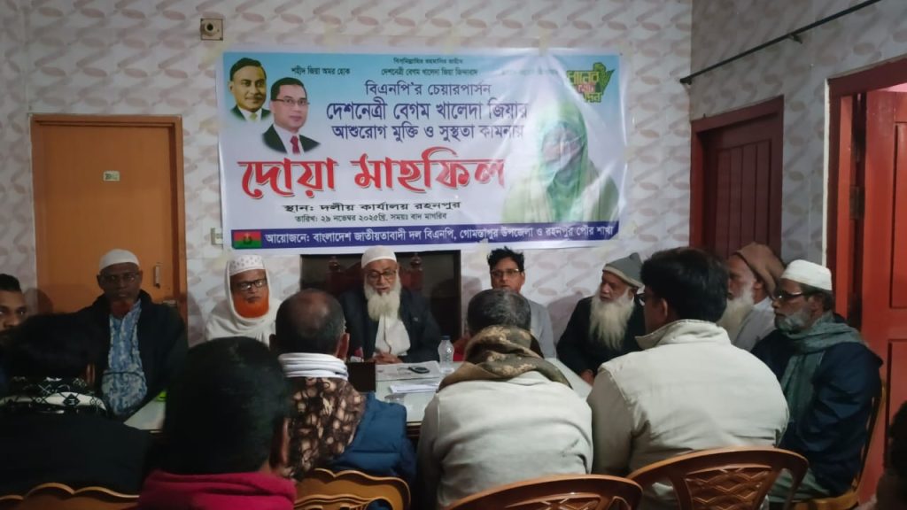 খালেদা জিয়ার সুস্থতা কামনায় গোমস্তাপুর উপজেলা বিএনপি’র আয়োজনে দোয়া মাহফিল অনুষ্ঠিত