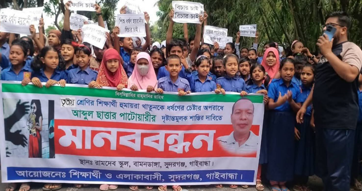 গাইবান্ধার সুন্দরগঞ্জ উপজেলার বামনডাঙ্গা ইউনিয়নের রামদেব স্কুল এলাকায় আজ সকাল থেকেই সমবেত হতে থাকে শত শত শিক্ষার্থী ও স্থানীয় সাধারণ মানুষ। সবার হাতে ছিল প্লেকার্ড আর মুখে ছিল বিচারের দাবিতে স্লোগান।