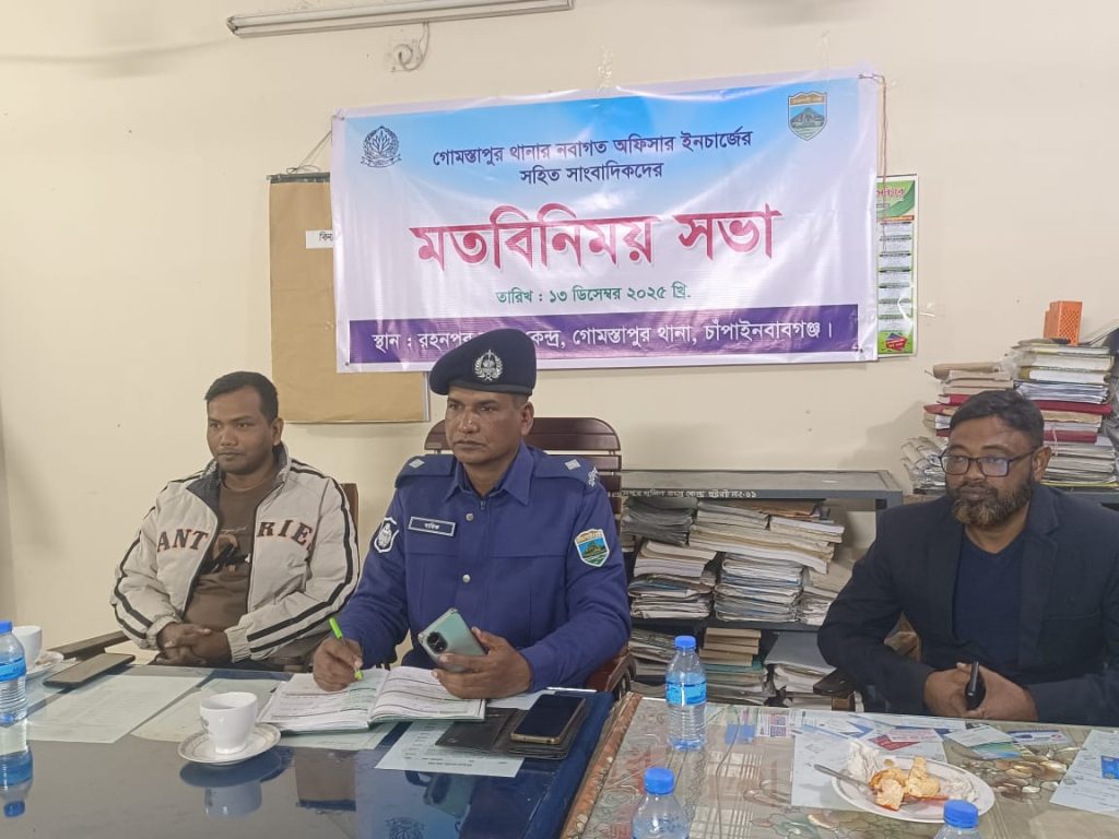 গোমস্তপুর থানায় নবাগত অফিসার ইনচার্জ আব্দুল বারিক গোমস্তাপুরে কর্মরত সাংবাদিকদের সাথে মতবিনিময় করেন এ সময় তিনি রোড ডাকাতি প্রতিরোধে সাংবাদিকদের সহযোগিতা কামনা করেন এবং মাদক নির্মুল, গরু চুরি রোধ, বিভিন্ন জুয়া বন্ধ বাল্যবিবাহ প্রতিরোধ শান্তি শৃঙ্খলা রক্ষায় আপনারা আমাকে তথ্য দিয়ে সহযোগিতা করবেন।সকলের প্রচেষ্টায় আমরা একটি সুন্দর গোমস্তাপুর থানা পরিচালনা করব। মতবিনিময়ে উপস্থিত ছিলেন এস আই গৌরাঙ্গ ও শামিম হোসেন,