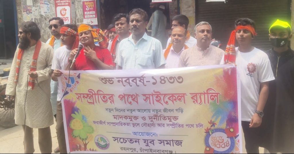 চাঁপাইনবাবগঞ্জের গোমস্তাপুরে রহনপুর সচেতন যুব সমাজের আয়োজনে পহেলা বৈশাখ উপলক্ষে সম্প্রীতির পথে চলি বিষয়কে সঙ্গে নিয়ে মাদক ও দুর্নীতিমুক্ত সমাজ বিনির্মাণের লক্ষে সাইকেল র্যালি অনুষ্ঠিত হয়েছে।