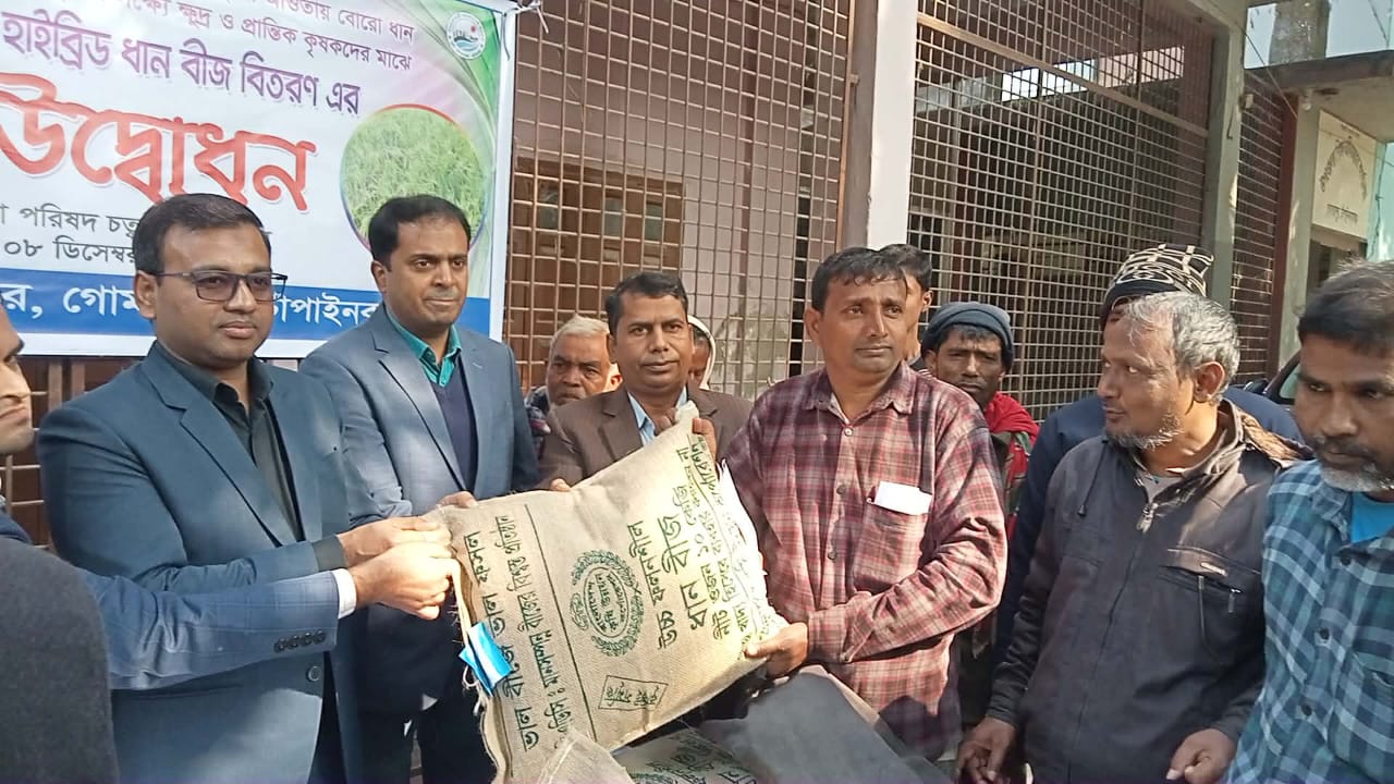 চাঁপাইনবাবগঞ্জের গোমস্তাপুর উপজেলায় ২০২৫-২৬ অর্থবছরের মৌসুমি কৃষি প্রণোদনা কর্মসূচির আওতায় পিছিয়ে পড়া কৃষকদের মধ্যে বিনামূল্যে ও হাইব্রিড ধান বীজ বিতরণ কার্যক্রমের শুভ উদ্বোধন করা হয়েছে। সোমবার (০৮ ডিসেম্বর)সকাল দশটায়। কৃষি সম্প্রসারণ অধিদপ্তরের আয়োজনে উপজেলা পরিষদ চত্বরে এ কার্যক্রমের উদ্বোধন করেন উপজেলা নির্বাহী কর্মকর্তা (ইউএনও) জাকির মুন্সী ও কৃষি কর্মকর্তা সাকলাইন হোসেন,