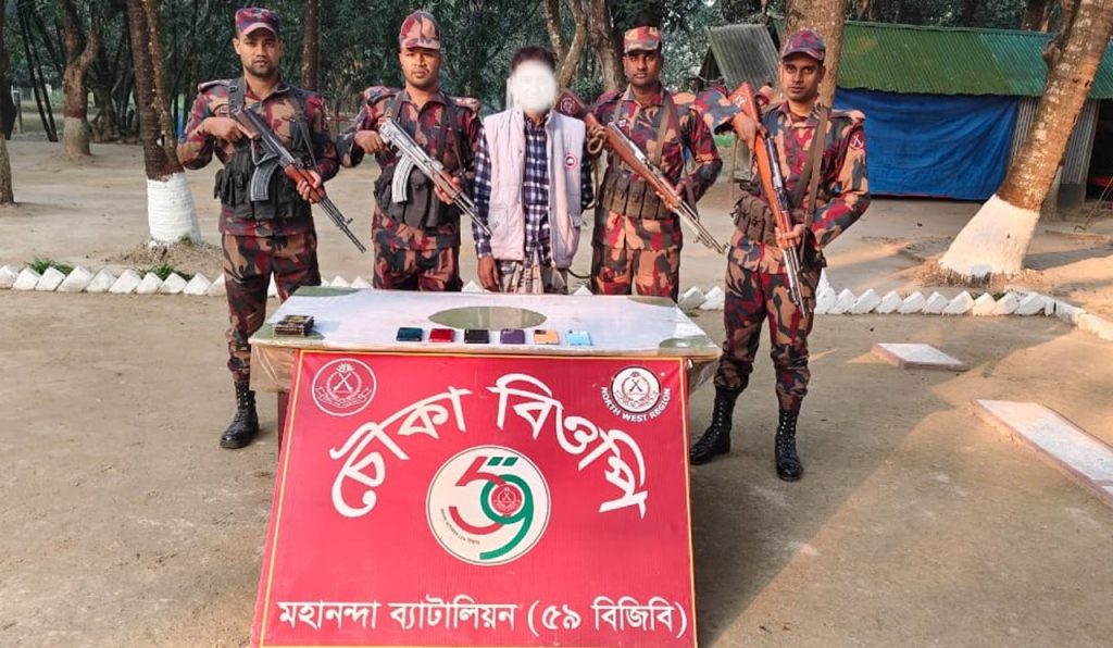 চাঁপাইনবাবগঞ্জ জেলার শিবগঞ্জ সীমান্তে গোপন সংবাদের ভিত্তিতে মহানন্দা ব্যাটালিয়ন (৫৯ বিজিবি) এর অধীনস্থ চৌকা বিওপি’র একটি বিশেষ টহল দল বেলা ২টা ৪৫ মিনিটে বিওপি’র দায়িত্বপূর্ণ এলাকায় এ অভিযান পরিচালনা করে। উক্ত অভিযানে সীমান্ত পিলার ১৭৭/২-এস হতে আনুমানিক ৮০০ গজ বাংলাদেশের অভ্যন্তরে চাঁপাইনবাবগঞ্জ জেলার শিবগঞ্জ উপজেলার বিনোদপুর ইউনিয়নের বাখের আলী গ্রাম হতে ৬টি ভারতীয় বিভিন্ন মডেলের ব্যবহৃত চোরাই মোবাইল ফোনসহ সাগর ইসলাম নামের একজনকে আটক করা হয়। আটককৃত আসামী সাগর ইসলাম শিবগঞ্জ উপজেলার কালুপুর গ্রামের মৃত নুরুল ইসলামের ছেলে। বর্তমানে আটককৃত আসামীসহ মোবাইল ফোনগুলো শিবগঞ্জ থানায় হস্তান্তরের কার্যক্রম চলমান রয়েছে।