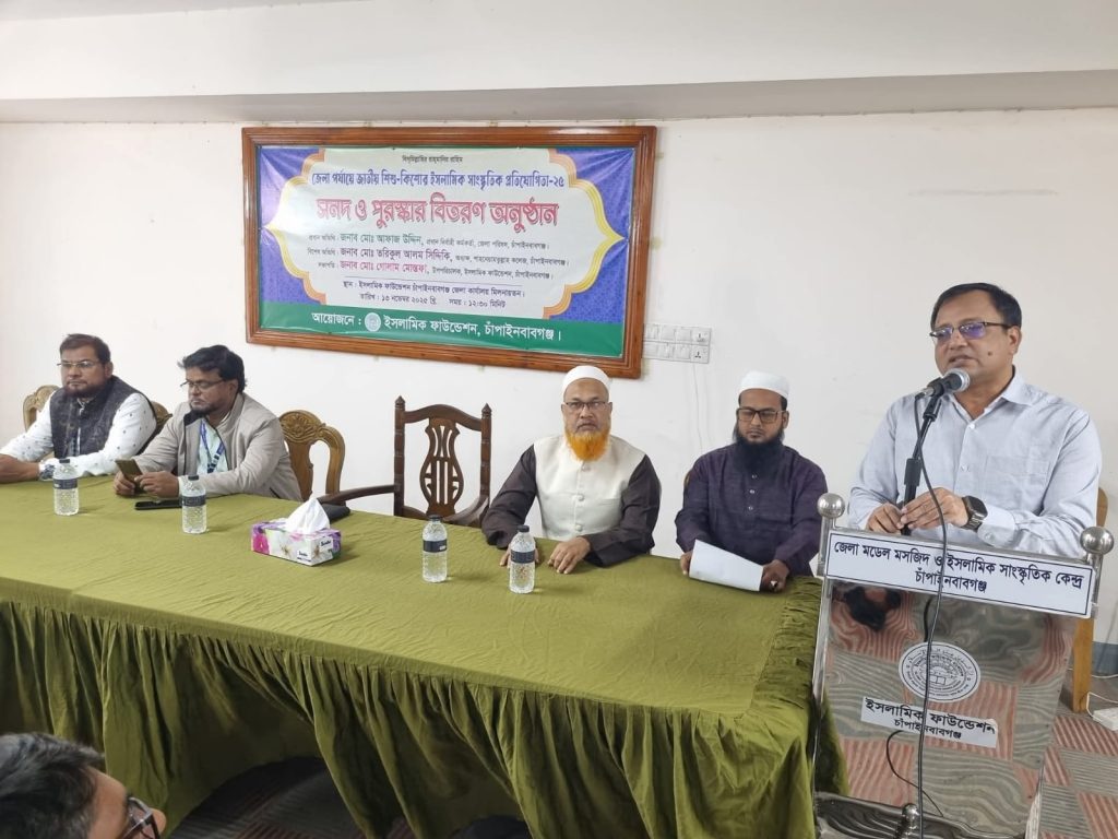 চাঁপাইনবাবগঞ্জে ইসলামিক ফাউন্ডেশনের আয়োজনে জাতীয় শিশু-কিশোর ও ইসলামিক সাংস্কৃতিক প্রতিযোগিতা-২০২৫ জেলা পর্যায়ে অনুষ্ঠিত হয়েছে। বৃহস্পতিবার (১৩ নভেম্বর) সকাল ১০টায় ইসলামিক ফাউন্ডেশন মিলনায়তনে এ প্রতিযোগিতা শুরু হয়। জেলার পাঁচটি উপজেলার বিভিন্ন শিক্ষা প্রতিষ্ঠানের প্রায় দুই শতাধিক শিক্ষার্থী বিভিন্ন বিষয়ে অংশগ্রহণ করে।
