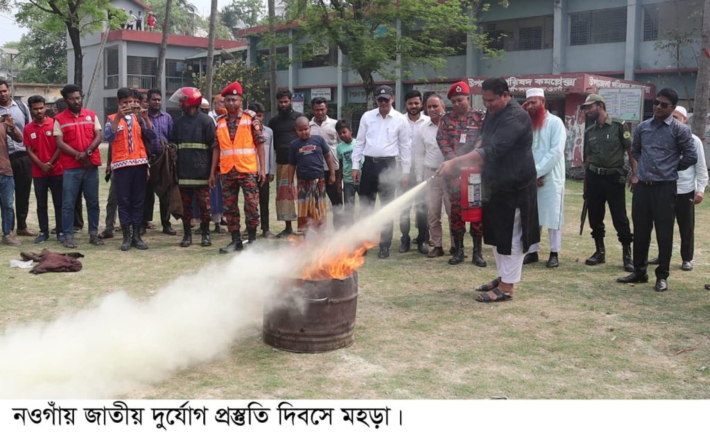 নওগাঁ জেলা প্রতিনিধি শামীম আনসারী ‘দুর্যোগ প্রস্তুতিতে লড়ব, তারুণ্যেও বাংলাদেশ গড়ব’ এই প্রতিপাদ্য নিয়ে মহড়া ও আলোচনা সভার মধ্য দিয়ে নওগাঁয় জাতীয় দুর্যোগ প্রস্তুতি দিবস পালিত হয়েছে। দিবসটি উপলক্ষে মঙ্গলবার সকাল সাড়ে ১০টায় সদর উপজেলা চত্বরে এক আলোচনা সভা অনুষ্ঠিত হয়। আলোচনায় প্রধান অতিথি ছিলেন- নওগাঁ সদর উপজেলা নির্বাহী কর্মকর্তা ইবনুল আবেদীন। এসময় নওগাঁ সদর উপজেলা প্রকল্প বাস্তবায়ন কর্মকর্তা মাহবুবুর রহমান এর সভাপতিত্বে বক্তব্য রাখেন, অতিরিক্ত পুলিশ সুপার মুশফিকুর রহমান, জেলা ত্রাণ ও পুনর্বাসন কর্মকর্তা আশেকুর রহমান, ফায়ার সার্ভিস ও সিভিল ডিফেন্সের উপ-সহকারী পরিচালক জাকির হোসেন ও জেলা প্রেসক্লাবের সভাপতি রায়হান আলম সহ অন্যরা বক্তব্য রাখেন। পরে সেখানে ভূমিকম্প ও অগ্নিকাণ্ড বিষয়ক এক মহড়া অনুষ্ঠিত হয়। এসময় ফায়ার সার্ভিস ও সিভিল ডিফেন্সসহ বেসরকারি সংস্থা রেড ক্রিসেন্ট ও স্কাউট সদস্যরা অংশ নেয়। এর আগে সদর উপজেলা চত্বর থেকে একটি র্যালি বের হয়।#