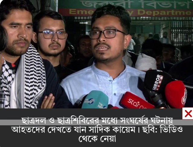 সাদিক কয়েম বলেন, বহিরাগতরা প্রবেশ করে হামলায় অংশ নিয়েছে। হামলাকারীরা আগে ছাত্রলীগের সঙ্গে সম্পৃক্ত ছিল। তারা আবার নতুন করে দেশকে অস্থিতিশীল করতে চায়। ছাত্রদল কতৃক শিবির ও সাধারণ শিক্ষার্থীদের ওপর হামলার নিন্দা জানাই। ১২ ফেব্রুয়ারি নির্বাচন পরবর্তী ছাত্রদলের সন্ত্রাসীরা ভিন্ন মতাদর্শীদের হামলা করছে। ১৬ জনকে আহত করা হয়েছে।
