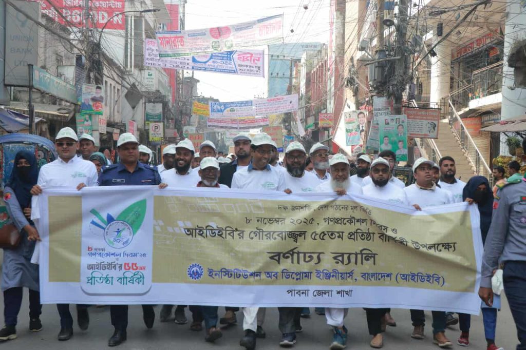 ১৫ নভেম্বর শনিবার সকালে পাবনায় “দক্ষ জনশক্তি-দেশ গঠনের মূল ভিত্তি” এই স্লোগানে বর্ণাঢ্য র‌্যালির মাধ্যমে ইনস্টিটিউশন অব ডিপ্লোমা ইঞ্জিনীয়ার্স,বাংলাদেশ (আইডিইবি) এর ০৮ নভেম্বর গণপ্রকৌশল দিবস ২০২৫ ও আইডিইবি’র গৌরবোজ্জ্বল ৫৫তম প্রতিষ্ঠা বার্ষিকী উপলক্ষে অনুষ্ঠান উদযাপিত হয়। পাবনা জেলা আইডিইবি’র আয়োজনে প্রধান অতিথি হিসেবে বর্ণাঢ্য র‌্যালির শুভ উদ্বোধন করেন পাবনা জেলা পুলিশ সুপার মোঃ মোরতোজা আলী খাঁন এর প্রতিনিধি পাবনা সদর সার্কেলের অতিরিক্ত পুলিশ সুপার মোঃ শরীফুল ইসলাম,বিশেষ অতিথি হিসেবে র‌্যালিতে উপস্থিত ছিলেন পাবনা পলিটেকনিক ইনস্টিটিউট এর উপাধ্যক্ষ প্রকৌ. মোঃ হুমায়ুন কবির,পাবনা প্রেসক্লাবের সাধারণ সম্পাদক মোঃ জহুরুল ইসলাম। র‌্যালির শুরুতে অতিথিদের সম্মাননা স্মারক তুলে দেন জেলা আইডিইবি’র সভাপতি মোঃ মহসীন আলী ও সাধারণ সম্পাদক মোঃ দেলওয়ার হোসেন। র‌্যালিটি মুক্তমঞ্চ থেকে শুরু হয়ে পাবনা শহরের প্রধান সড়ক আব্দুল হামিদ রোড প্রদক্ষিণ শেষে আবার মুক্তমঞ্চে শেষ হয়। র্যালি শেষে মুক্তমঞ্চে সংক্ষিপ্ত আলোচনায় জেলা আইডিইবি’র সভাপতি মো: মহসীন আলী সভাপতিত্বে প্রধান অতিথির বক্তব্য রাখেন পুলিশ সুপারের প্রতিনিধি অতিরিক্ত পুলিশ সুপার মো: শরীফুল ইসলাম,জেলা আইডিইবি’র সাধারণ সম্পাদক মো: দেলওয়ার হোসেন, পাবনা পলিটেকনিক ইনস্টিটিউট এর উপাধ্যক্ষ প্রকৌ. মোঃ হুমায়ুন কবির, আইডিইবি’র প্রবীণ সদস্য ও অবসরপ্রাপ্ত উপজেলা প্রকৌশলী মোঃ ওয়ারেছ উদ্দিন। র‌্যালি ও আলোচনা সভায় বিভিন্ন দপ্তরে কর্মরত ডিপ্লোমা ইঞ্জিনিয়ারগণ, চাকুরি প্রত্যাশী ও ব্যবসায়ী ডিপ্লোমা প্রকৌশলী ও বিভিন্ন পলিটেকনিক ইনস্টিটিউটের শিক্ষার্থী মিলে প্রায় ০৬ শতাধিক শুভানুধ্যয়ী অংশগ্রহণ করেন।