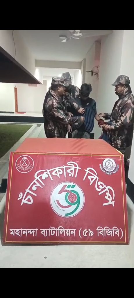 ভোলাহাট সীমান্তে ৫০ বোতল নেশাজাতীয় সিরাপ সহ ১ জনকে আটক করেছে মহানন্দা ব্যাটেলিয়ান