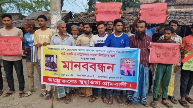 শনিবার (১৮ এপ্রিল) বিকেলে সদর উপজেলার গোবরাতলা ইউনিয়নের ঘুঘুডিমা বাজারে স্থানীয় গ্রামবাসী এই মানববন্ধনের আয়োজন করে।