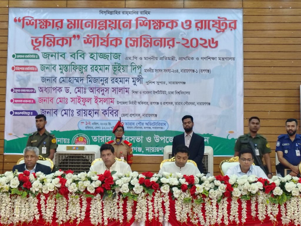 নারায়ণগঞ্জের রূপগঞ্জে শিক্ষার মানোন্নয়নে শিক্ষক ও রাষ্ট্রের ভূমিকা শীর্ষক সেমিনার অনুষ্ঠিত। ১২ই এপ্রিল রবিবার তারাব পৌর অডিটোরিয়ামে এই সেমিনার আয়োজন করেন তারাব পৌরসভা ও রূপগঞ্জ উপজেলা প্রশাসন। নারায়ণগঞ্জ জেলা প্রশাসক মোঃ রায়হান কবিরের সভাপতিত্বে অনুষ্ঠানে প্রধান অতিথি হিসেবে ছিলেন প্রাথমিক ও গনশিক্ষা মন্ত্রণালয়ের প্রতিমন্ত্রী ববি হাজ্জাজ, বিশেষ অতিথি হিসেবে উপস্থিত ছিলেন নারায়ণগঞ্জ-০১ রূপগঞ্জ আসনের সংসদ সদস্য মুস্তাফিজুর রহমান ভূঁইয়া দিপু, নারায়ণগঞ্জ জেলা পুলিশ সুপার মোঃ মিজানুর রহমান মুন্সী। অনুষ্ঠানে মূখ্য আলোচক হিসেবে বক্তব্য রাখেন ঢাকা বিশ্ববিদ্যালয়ের শিক্ষা ও গবেষণা বিভাগের অধ্যাপক ড. মোঃ আব্দুস সালাম। সেমিনারে স্বাগত বক্তব্য রাখেন রূপগঞ্জ উপজেলা নির্বাহী অফিসার মোঃ সাইফুল ইসলাম।