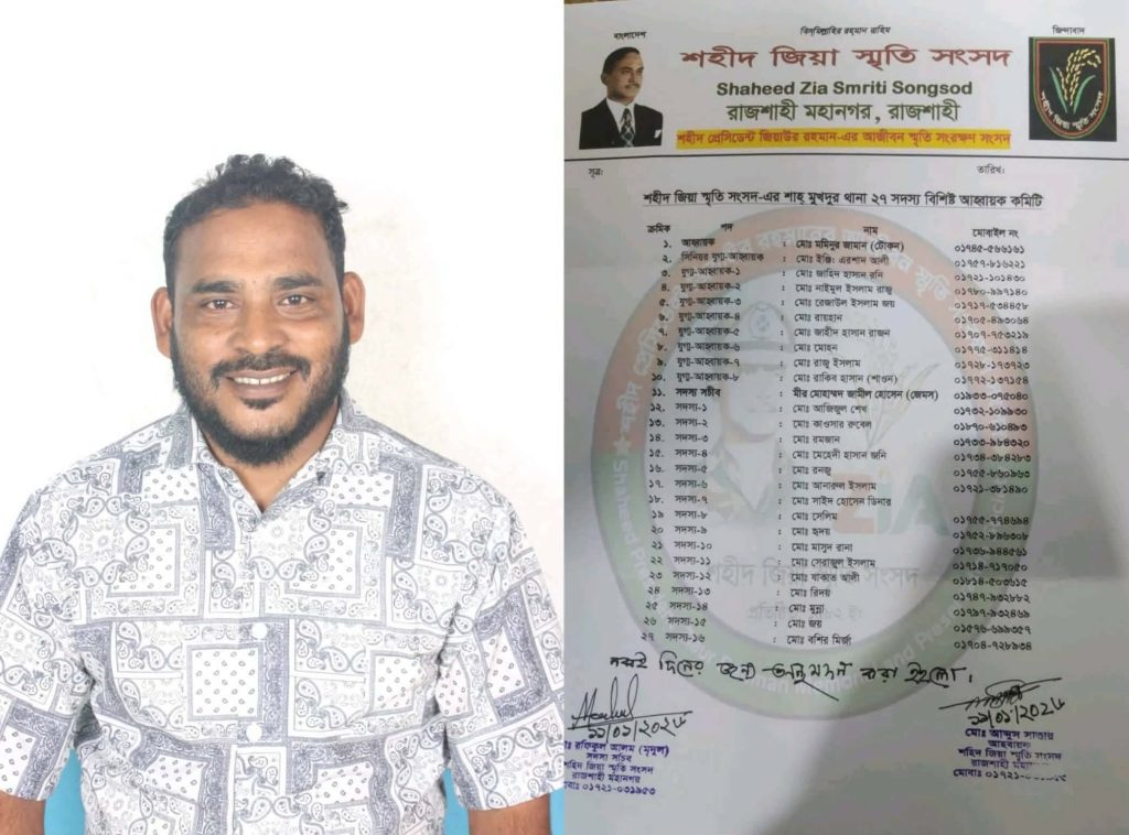 জানা যায়,শহীদ জিয়া স্মৃতি সংসদ শাহমুখদম থানার কমিটিতে স্থান পাওয়া মো : মমিনুর জামান টোকন নগরীর ১৭ নং ওয়ার্ডের নওদাপাড়া বাসিন্দা।