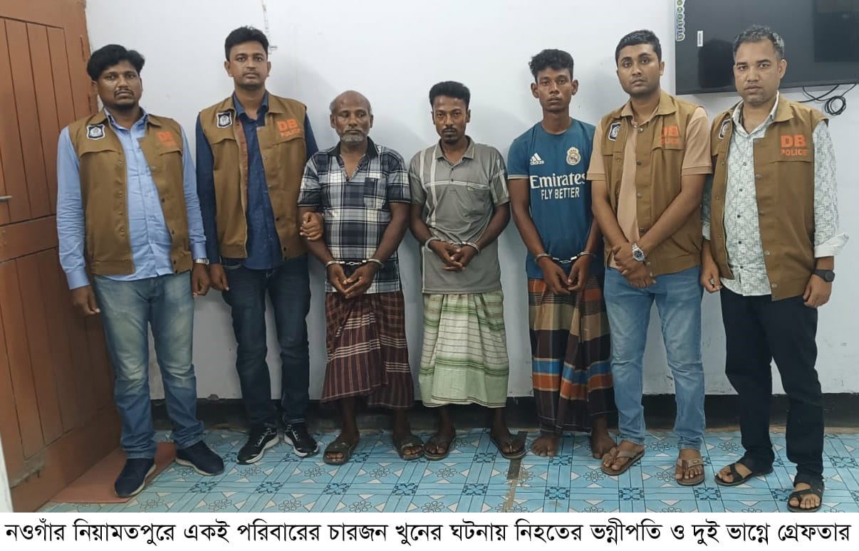 নওগাঁর নিয়ামতপুরে একই পরিবারের দুই শিশুসহ স্বামী-স্ত্রীকে গলাকেটে হত্যার ঘটনায় রহস্য উদঘাটন সহ তিনজনকে গ্রেফতার করা হয়েছে। এ ঘটনায় হত্যাকান্ডে ব্যবহৃত ছোরা ও হাঁসুয়া উদ্ধার করা হয়েছে। সম্পদের লোভে বসিভুত হয়ে এ হত্যা কান্ডে চাচাতো ভাই, ভাগ্নে ও ভগ্নীপতি সহ ছয়জন অংশ নেয়। বুধবার দুপুর ২টা পুলিশ সুপার কার্যালয়ে সংবাদ সম্মেলন করে এসব কথা জানান- নওগাঁ পুলিশ সুপার মোহাম্মদ তারিকুল ইসলাম।