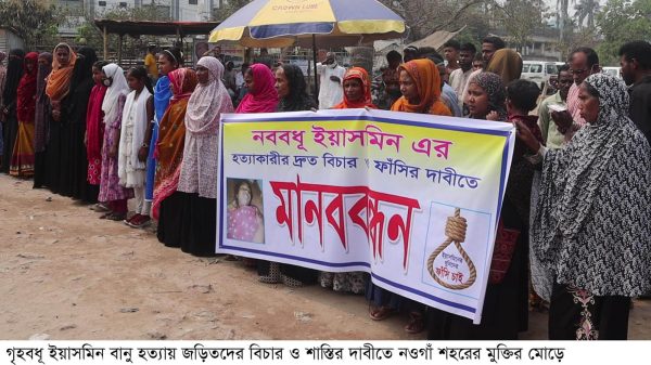 নওগাঁয় গৃহবধূ ইয়াসমিন হত্যার বিচারের দাবিতে মানববন্ধন