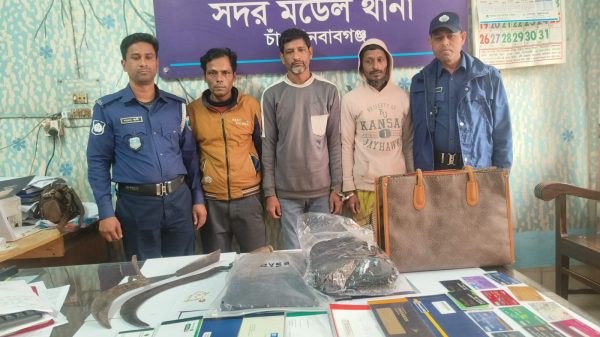 চাঁপাইনবাবগঞ্জে পরিবারসহ ব্যবসায়ীকে অস্ত্র ঠেকিয়ে ছিনতাই: ৩ জন গ্রেফতার, মালামাল উদ্ধার