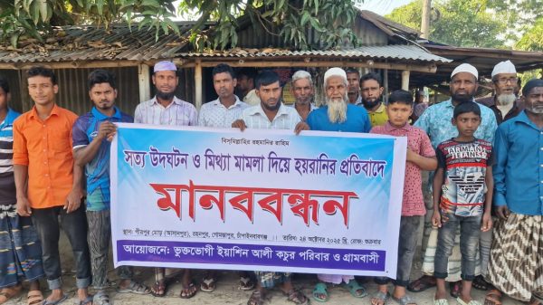 গোমস্তাপুরে কবিরাজের দেয়া তথ্যে মামলার আসামী করে হয়রানি, প্রতিবাদে গ্রামবাসীর মানববন্ধন